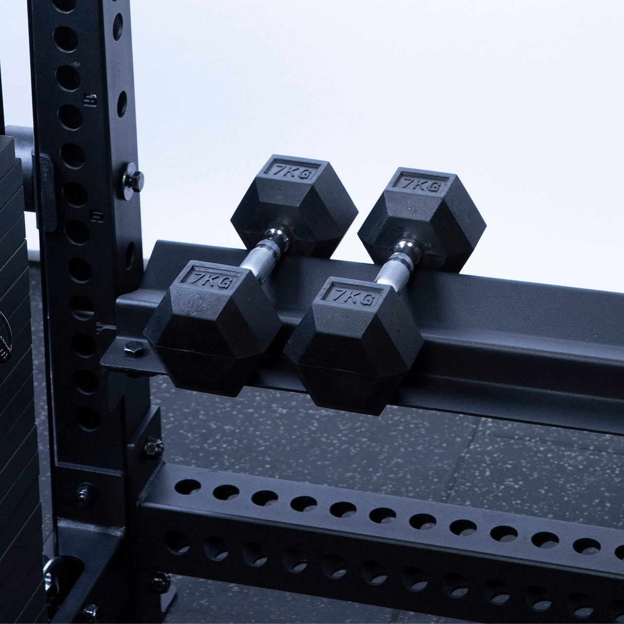 The Primal Performance Series Dumbbell Shelf fits neatly on to the rear uprights of the Primal Performance Series Power Rack or Half Rack bolting on to the frame on each side.
